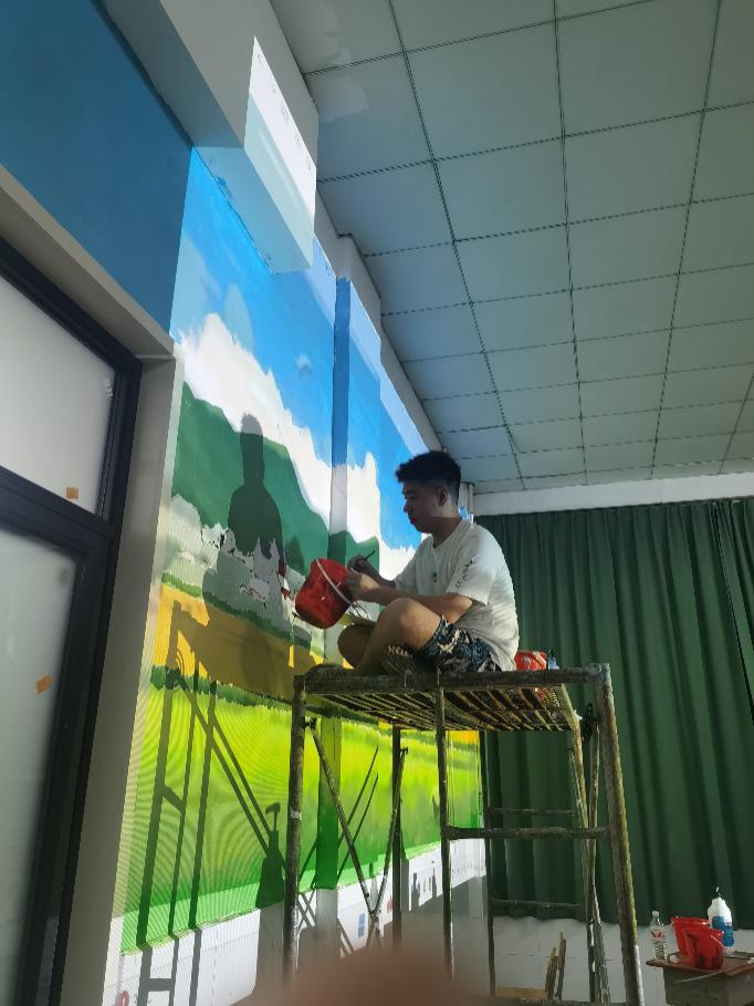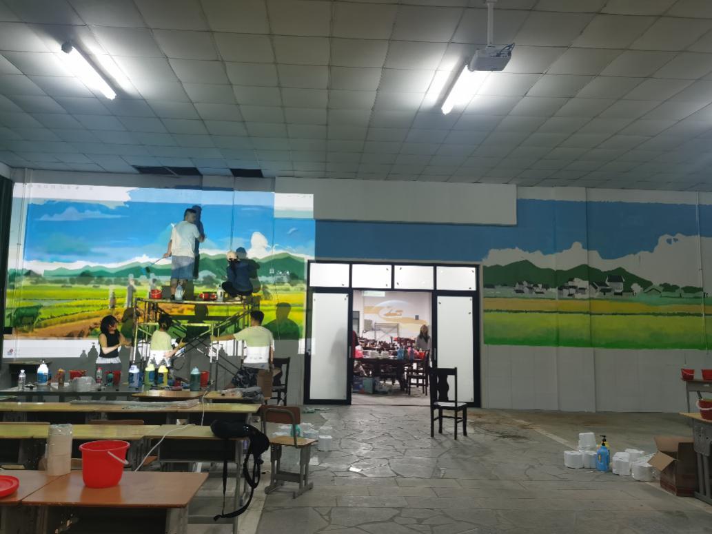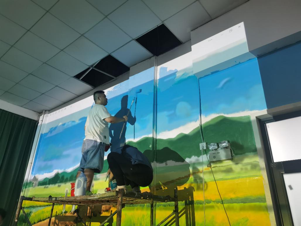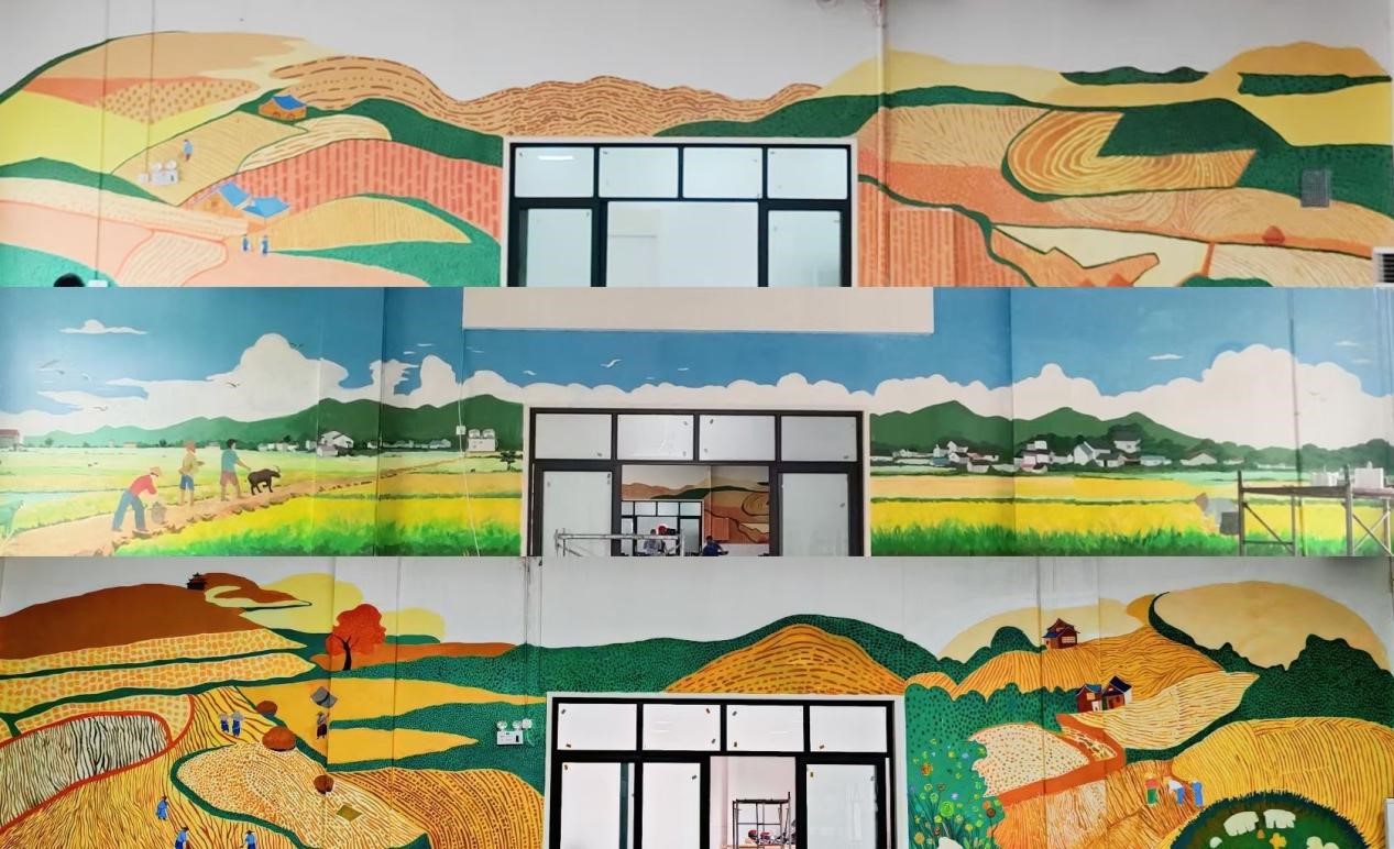 经过数日的紧张创作,三面墙绘作品终于圆满完成,墙绘的点缀不仅延伸了多功能厅的空间深度,更让观者仿佛置身于那片充满生机的田野之中,感受到了乡村振兴的勃勃生机。