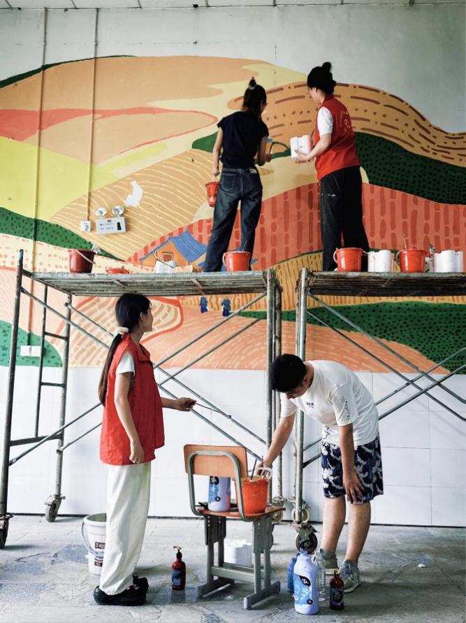 随后,实践团墙绘创作组成员们来到了鼎城区乡村振兴学校,墙绘地点在该校集 “礼堂、教室、食堂”三合一多功能厅的三面墙体,墙绘创作组成员们迅速展开了墙绘创作设计,构图研讨会。他们巧妙利用大厅的纵向空间,以稻田为视角,绘制了一幅村民在广袤田野间辛勤劳作、共享丰收的宏大场景,采用了简约而温馨的平面装饰手法,以暖色调的大色块为主,通过点、线等元素的巧妙运用,将稻田与村庄完美融合于一墙之上,展现出了秋日里丰收的喜人景象。作品的设计创作不仅可以美化了多功能厅的环境,更让观者感受到乡村稻作文化的独特魅力。