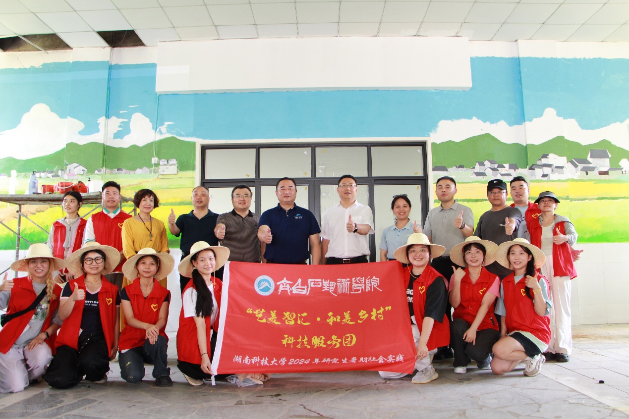 在墙绘创作现场,鼎城区委书记陈远、副区长杨俊、团区委刘志宏等区镇领导和公司离退休处处长廖志鹏、公司党委书记巢炜、经理赵湘学教授来现场慰问了实践团成员们,并悉心指导给予建议,希望大家的艺术创作扎根本土,根植时代,用艺术作品充分展现咱们种粮人依靠自身力量端牢中国饭碗的底气。