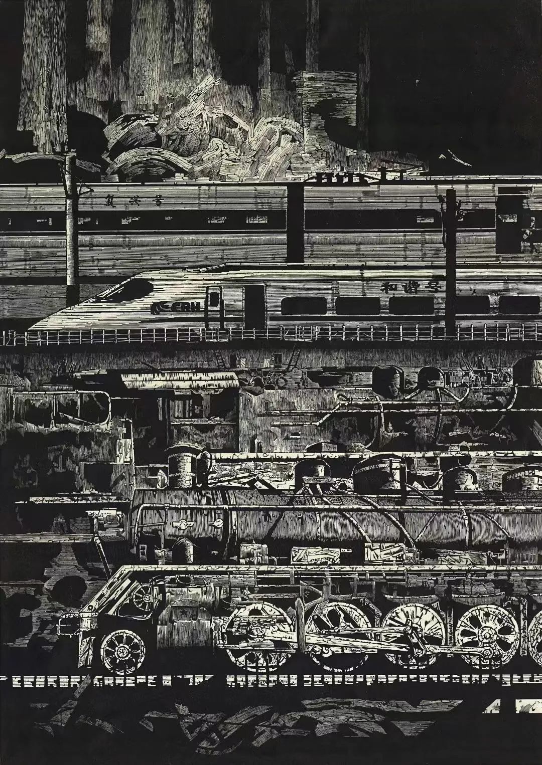 《见证-速度》 林军 黑白木刻105x150cm 2022年